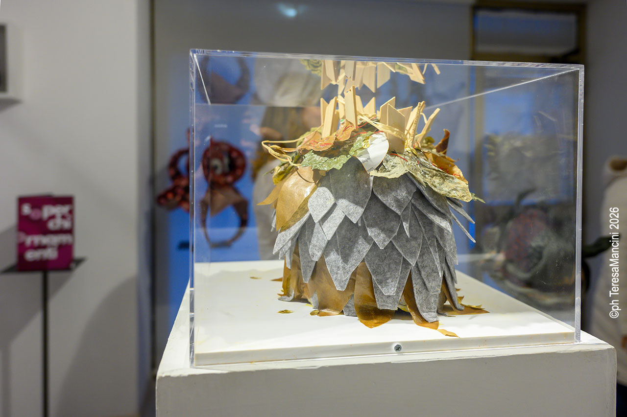Indossabile ma simbolica, BIOS trasforma il capo – luogo del pensiero e dell’identità – in un territorio naturale, fragile e interconnesso. Feltro, elementi naturali, crochet, carta e legno dialogano in una forma organica che evoca cicli vitali, stratificazioni, memorie della materia. La scelta dei materiali sottolinea un ritorno all’essenziale e al gesto lento, opponendosi alla logica dello sfruttamento e del consumo.