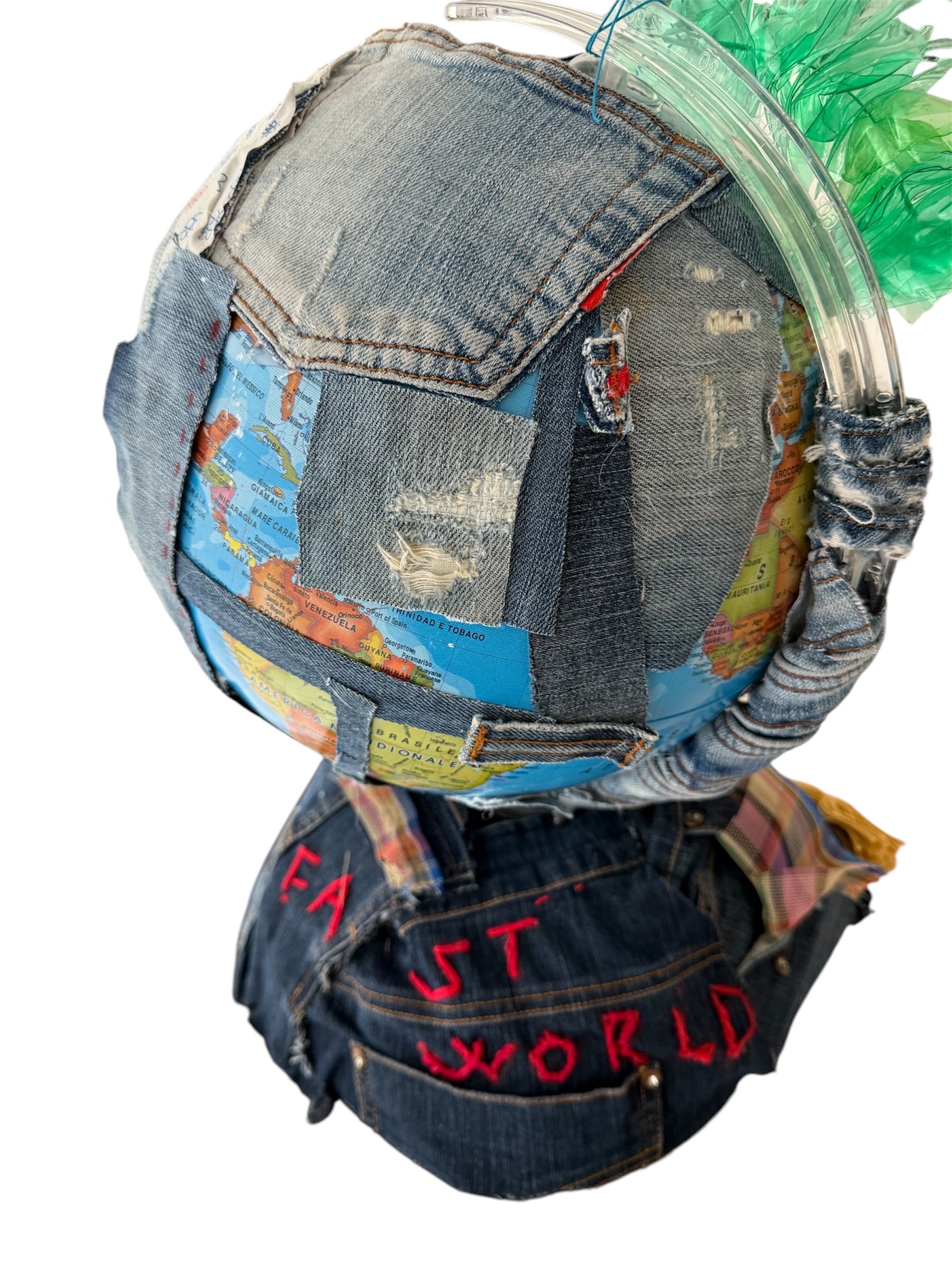 The installation represents worlds completely suffocated by textiles! One globe is entirely covered, with only a few glimpses of sea visible; the other has become a system that has replaced the geographical topography of the world, where we see only fast fashion and chaotic interconnections.