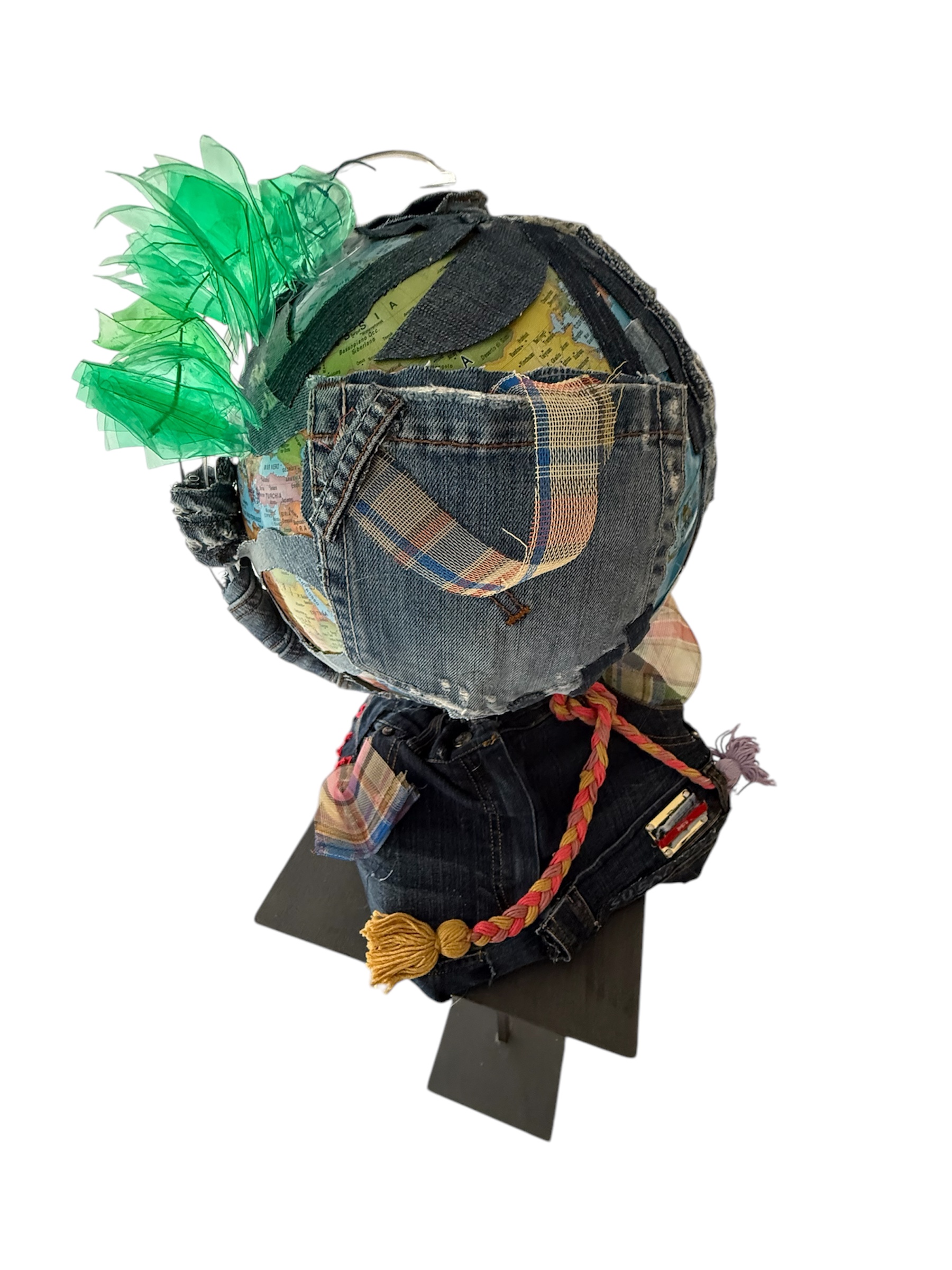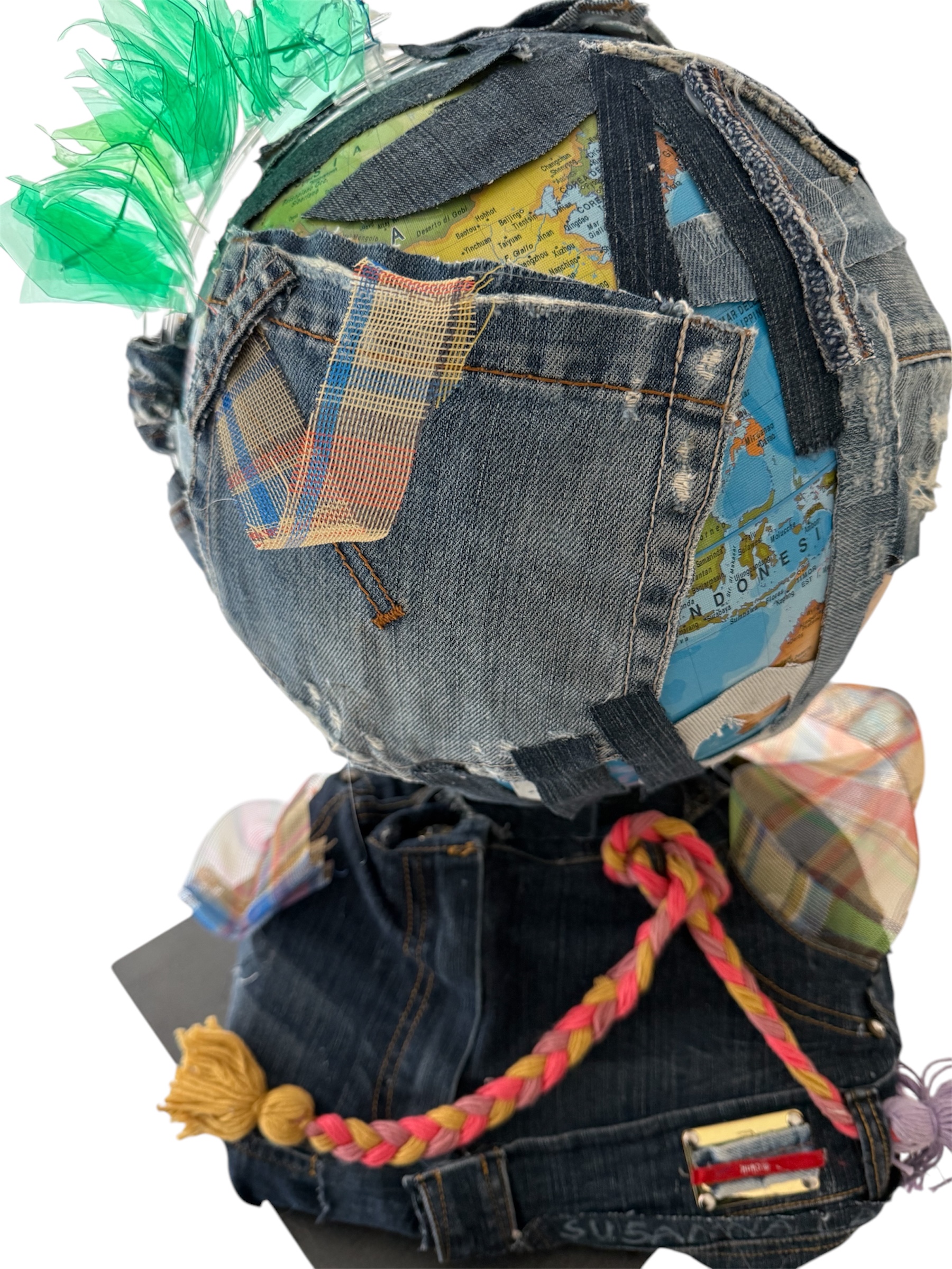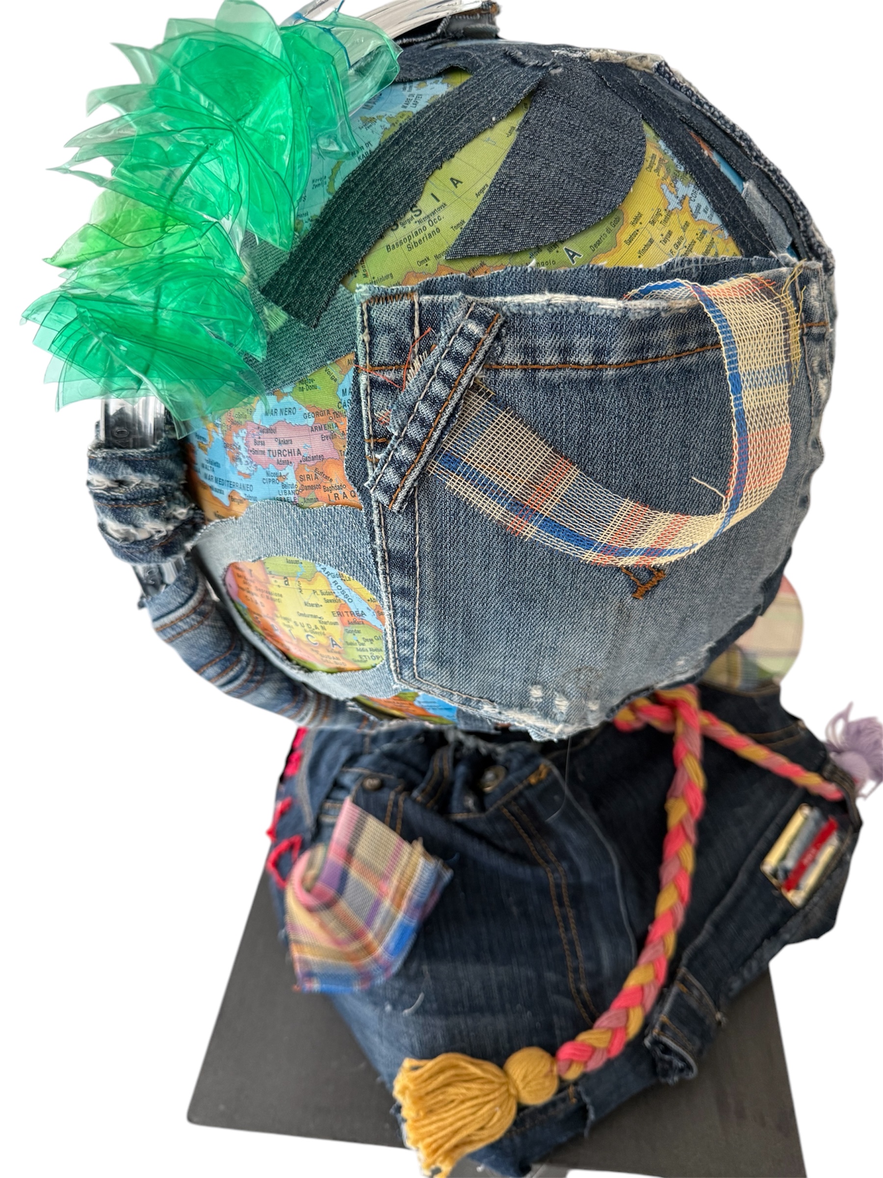Fiber artist Susanna Cati, a frequent visitor to the recycling center, gifted the reuse center a double artistic installation created using old globes and one of the most popular styles of the ’90s: GRUNGE. (Think of the musical movements that first inspired the genre, like Nirvana.)