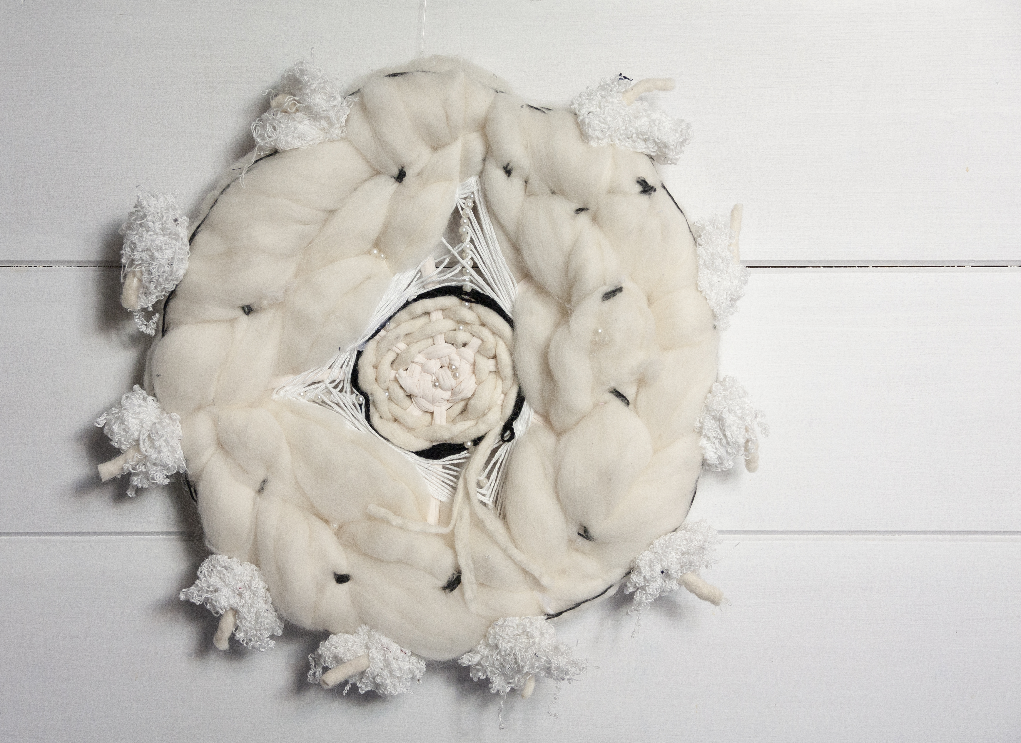 Tecnica utilizzata: tecnica di intreccio e applicazioni di elementi in lana, lana naturale e lana feltrata a mano.