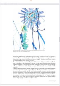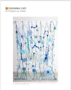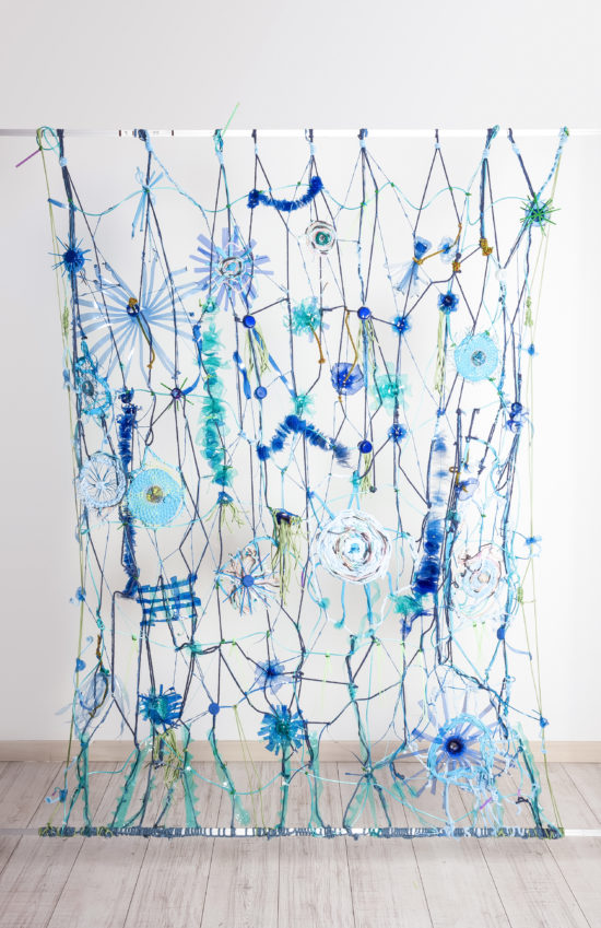 Nessuno sa calcolare quanta plastica finisca davvero in mare – si ipotizza tra i 4,8 e i 12,7 milioni di tonnellate all’anno – ma ciò che sappiamo di certo è che disgregandosi in microplastiche essa si deposita in tutti gli elementi dell’ecosistema marino, ovunque dai sedimenti dei fondali oceanici più profondi al ghiaccio che galleggia nell’Antartico. E’ un nemico pervasivo, nascosto nell’ingannevole trasparenza dell’acqua, annidato sotto il seducente avvicendarsi di un infinita scala di blu e di verdi del mare.A questa invasione silenziosa, capillare e pericolosa è ispirata l’opera in mostra di Susanna Cati in cui ,come un sasso lanciato nell’acqua ,svela la sostanza dietro all’apparenza ,porta alla luce le insidie rintanate al di sotto della superficie .Culliamo l’illusione romantica del mare dimenticando che la devastante azione umana si insinua sistematicamente tra le sue onde, un pezzo di plastica alla volta, espandendosi come una metastasi. L’artista pone l’osservatore davanti alla verità cruda mostrando ,attraverso una cifra esasperata e surreale, l’evoluzione di questo processo di colonizzazione, restituendoci un fondale marino plasmato dall’interazione dell’acqua e della plastica, una porzione di bioma che ne evoca l’armonia cromatica, la pluralità di forme, la ricchezza di biodiversità, ma che ne è soltanto una replica artificiosa ,un guscio vuoto ormai privo di ogni organismo vivente, utile solo nella sua bellezza estetica ad appaga gli occhi che non vogliono vedere.(Barbara Pavan)