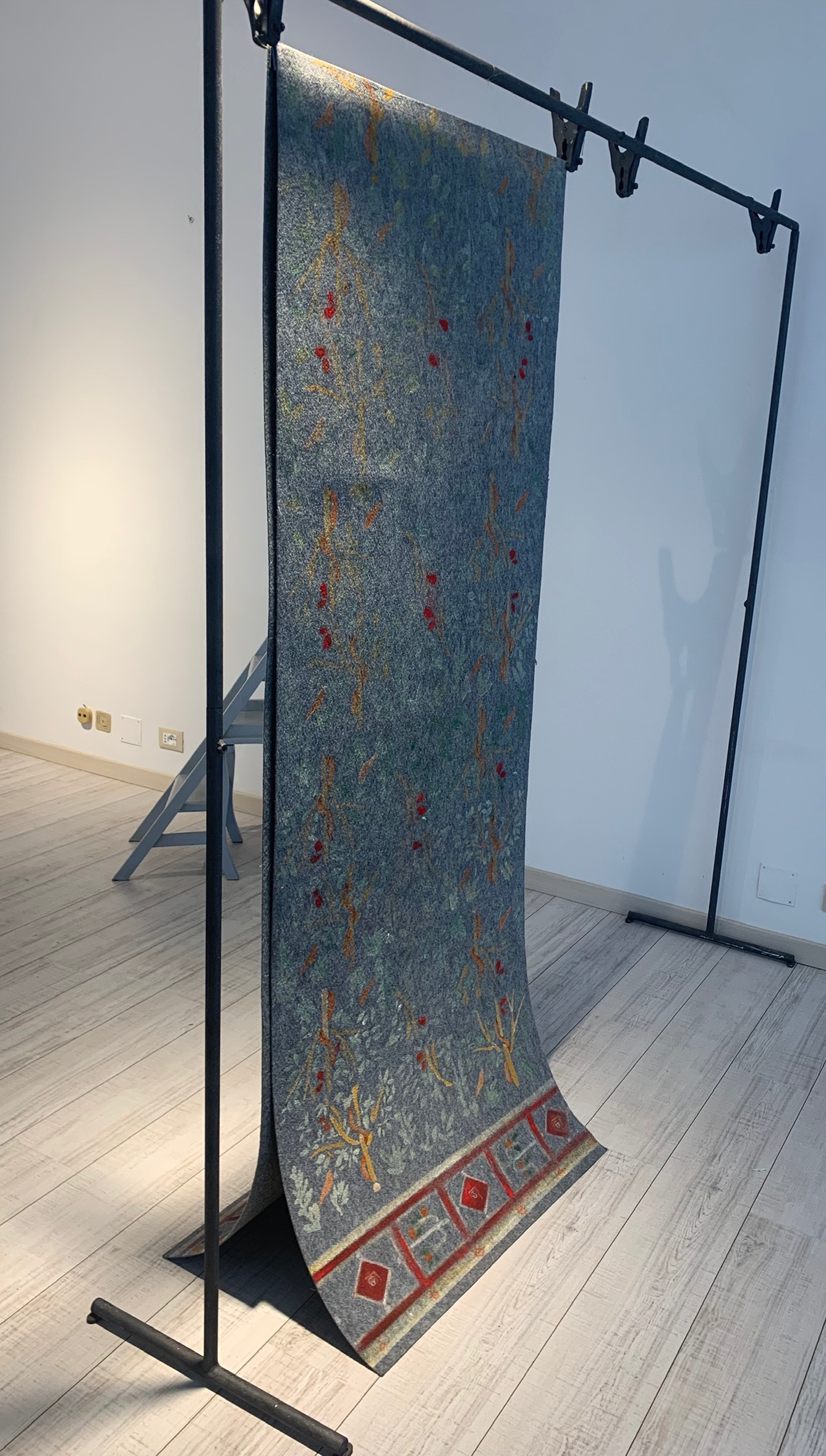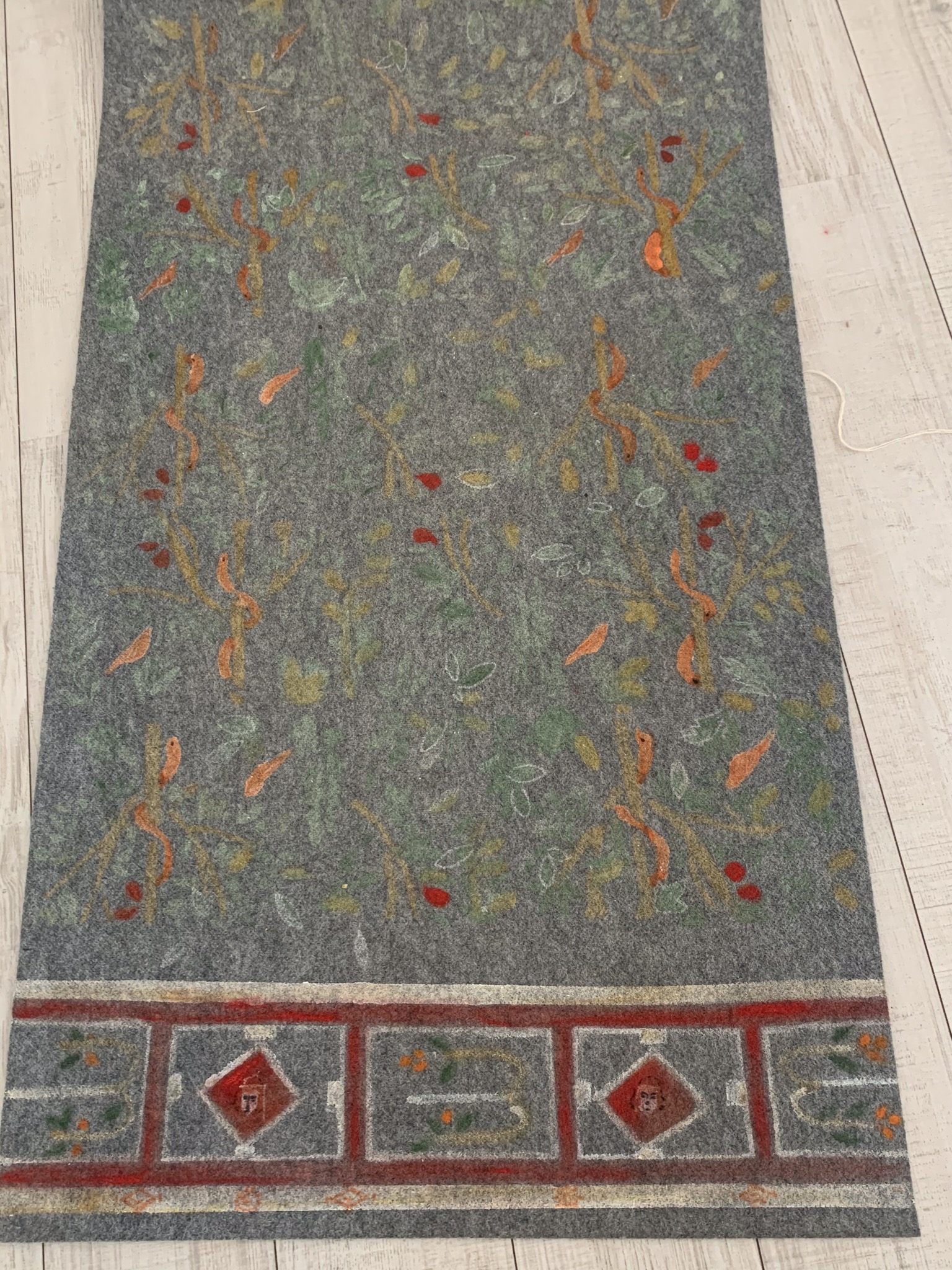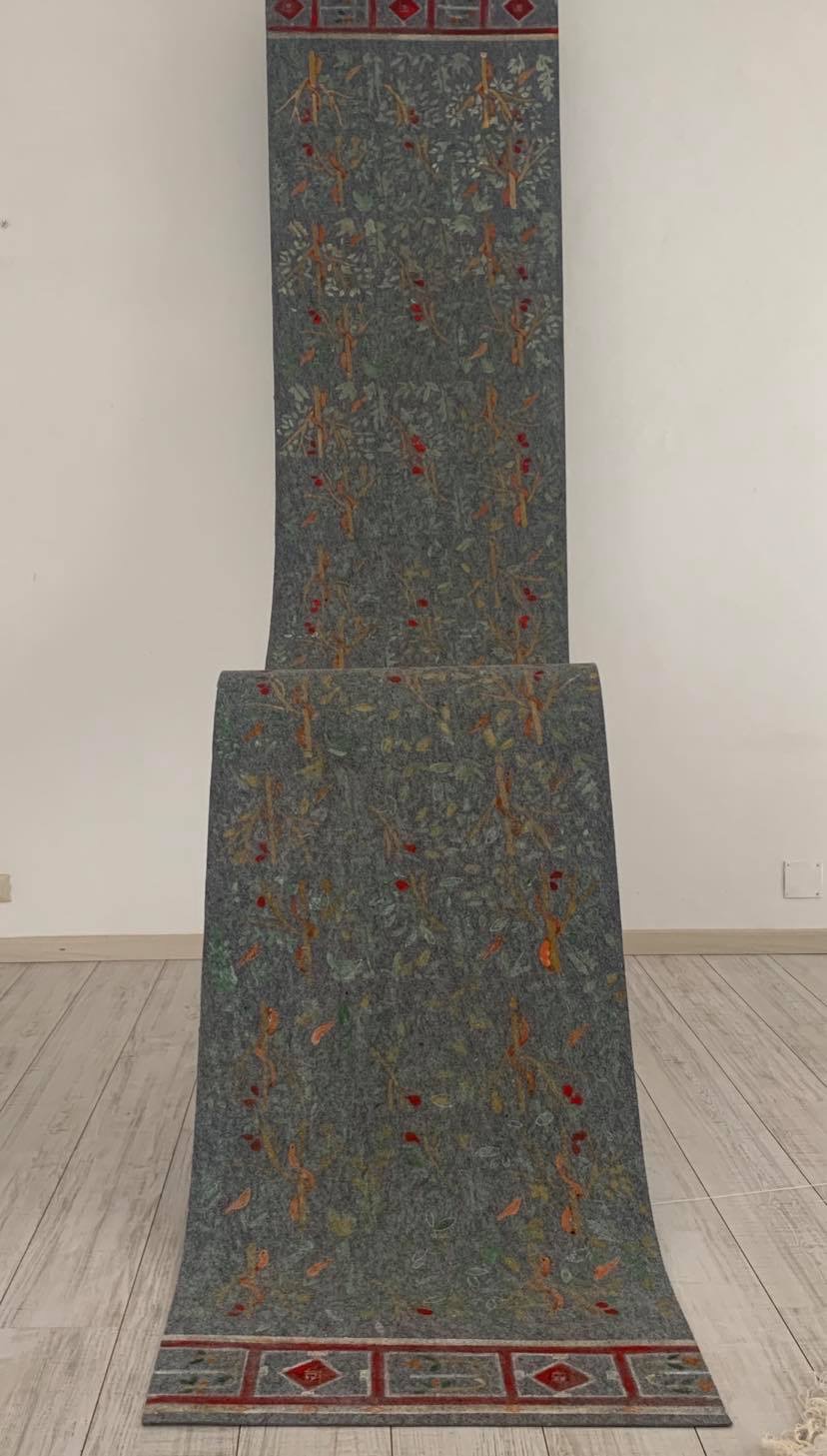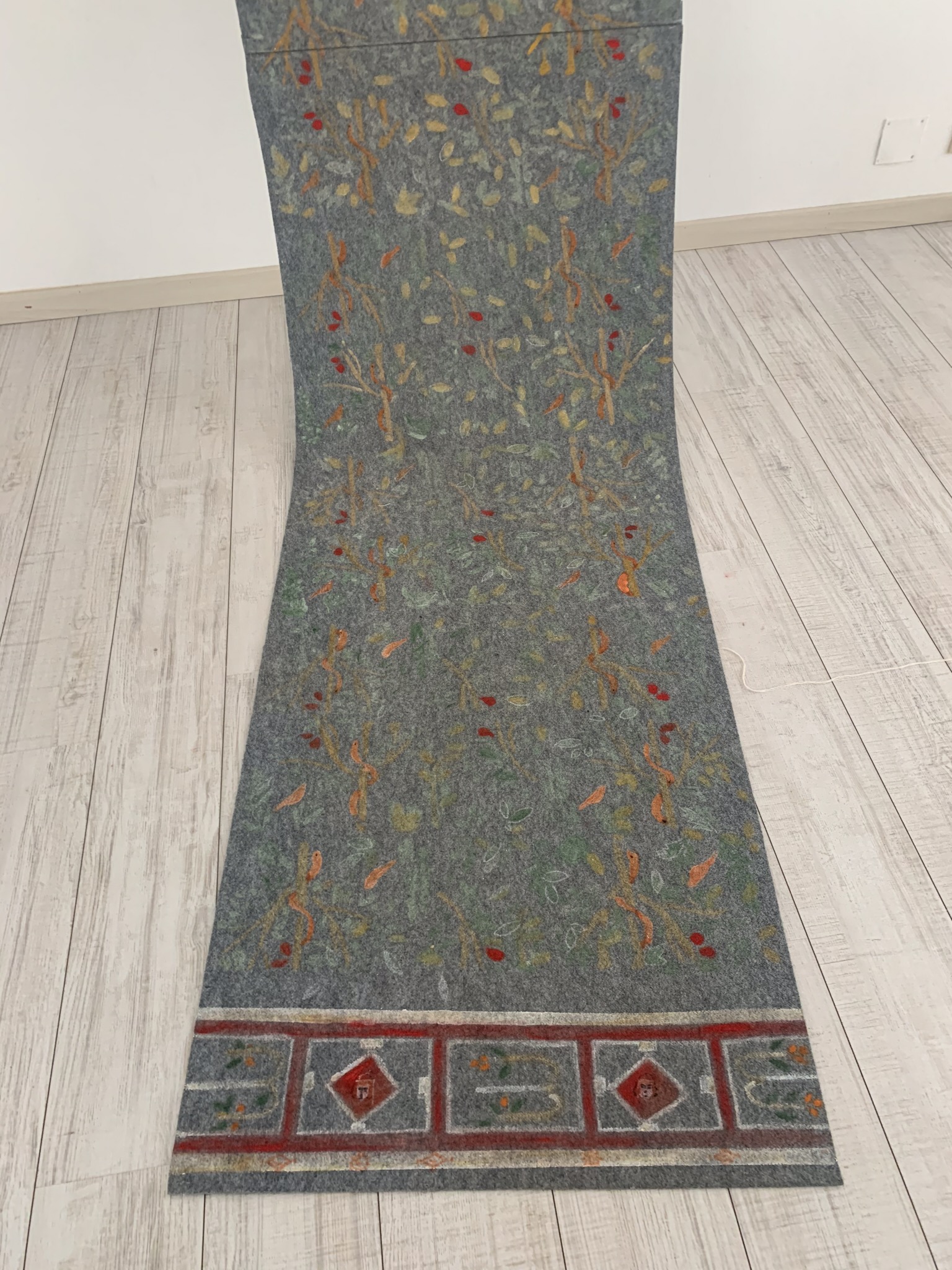 a hand-painted carpet with acrylic and natural pigments,4 meters long and 76 cm wide