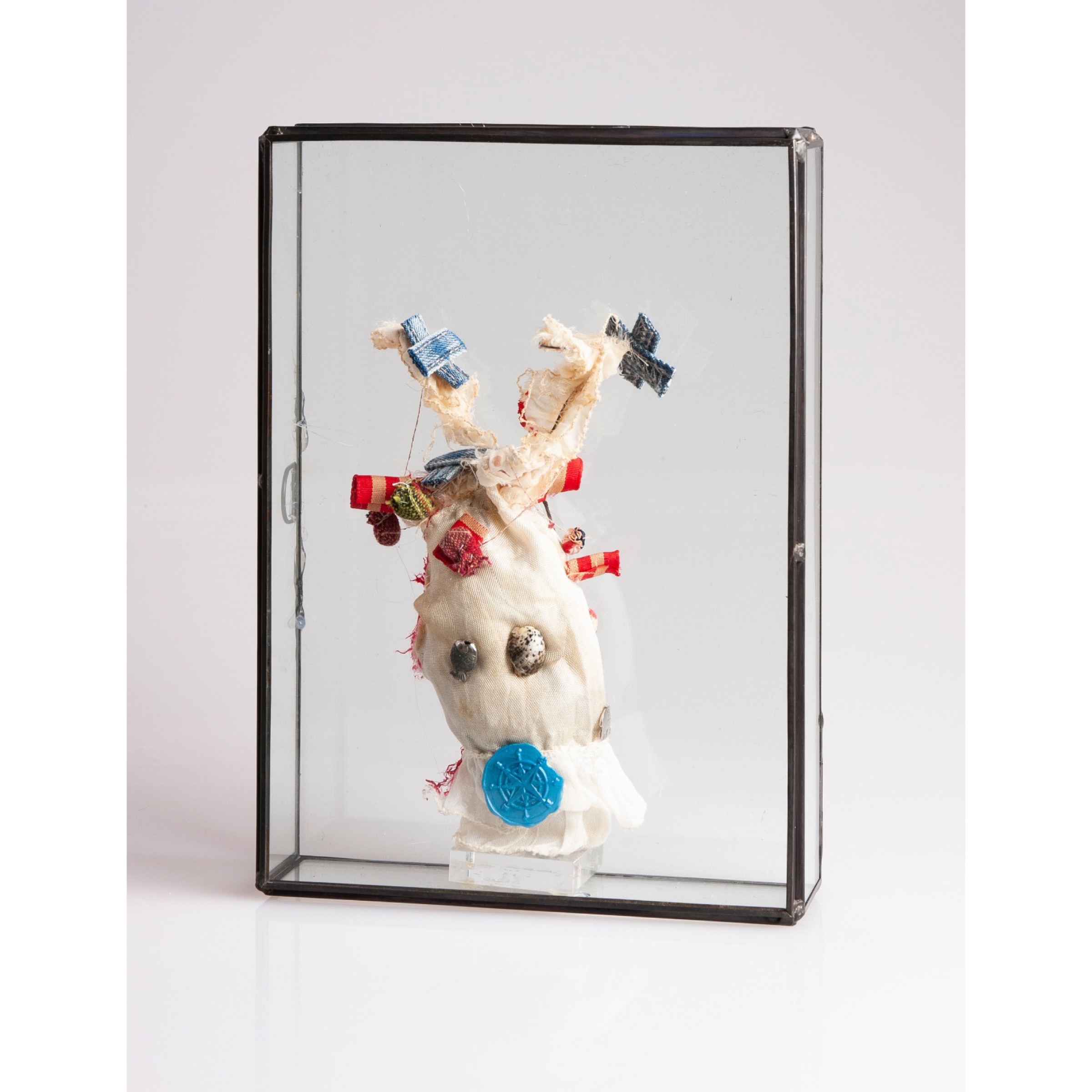 materiale: tessuto , elementi vari, scatola in vetro piombato.