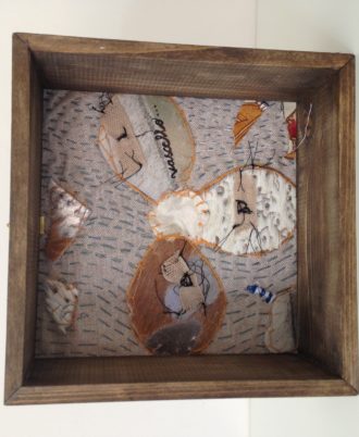 Mini arazzo composto con tessuti dell’autrice inseriti in piccola scatola di legno.