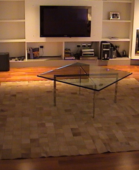 Tappeto in cavallino su disegno dell’autrice composto da piccoli quadrati in finto cavallino montati assieme per living.