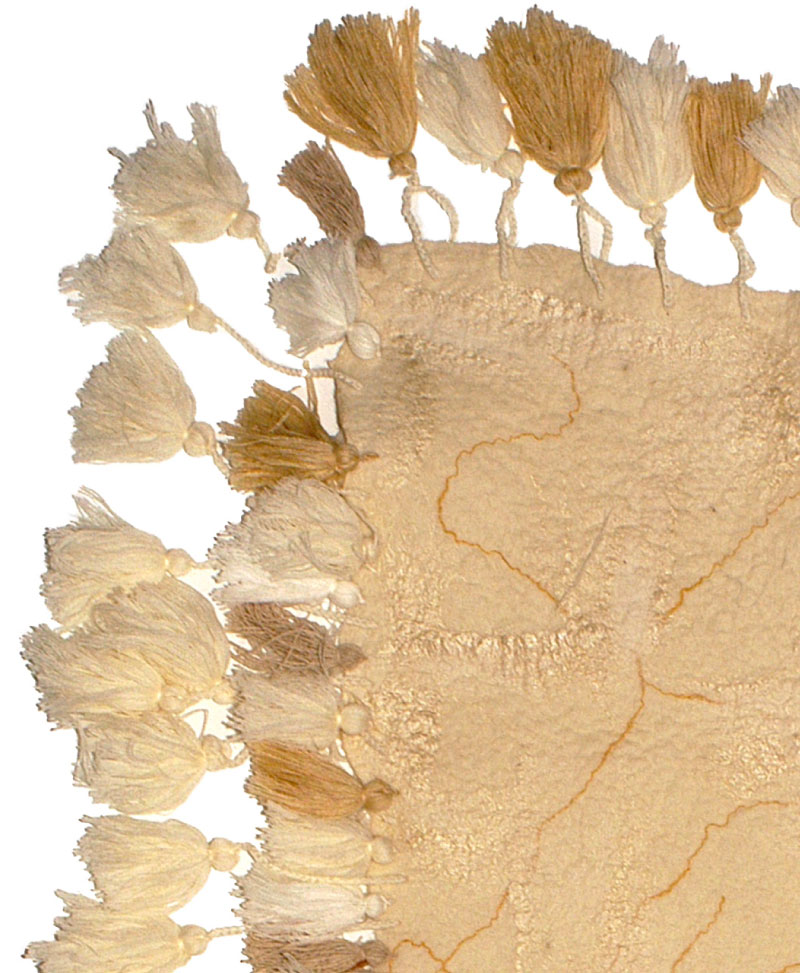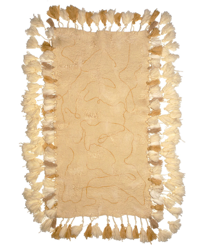 appeto composto da superficie nunofeltro (di Claudia Roncalli) e doppia fila di frange in lana bicolore. Il progetto dell'artista.