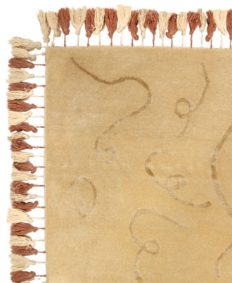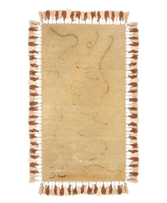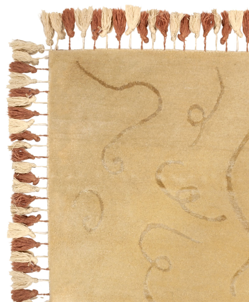 Annodato a mano con nodo tibetano, ton sur ton, è la rielaborazione contemporanea di un tappeto dal sapore tribale, Presenta una doppia frangia bicolore su tutti i lati della superficie.