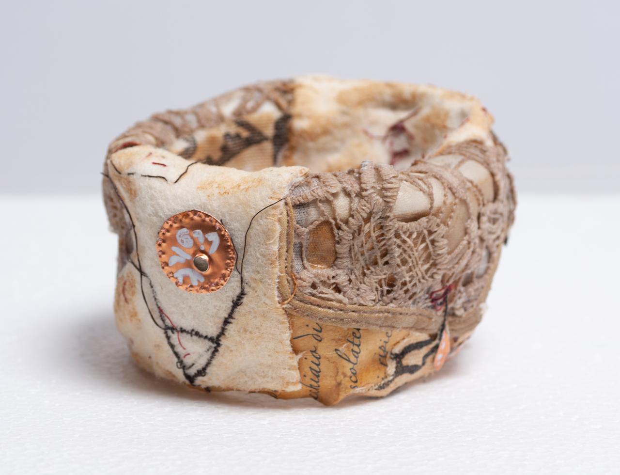 Papier-mâché with gauze, paper, and textiles; copper; threads.