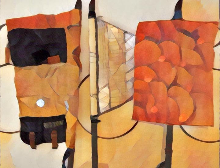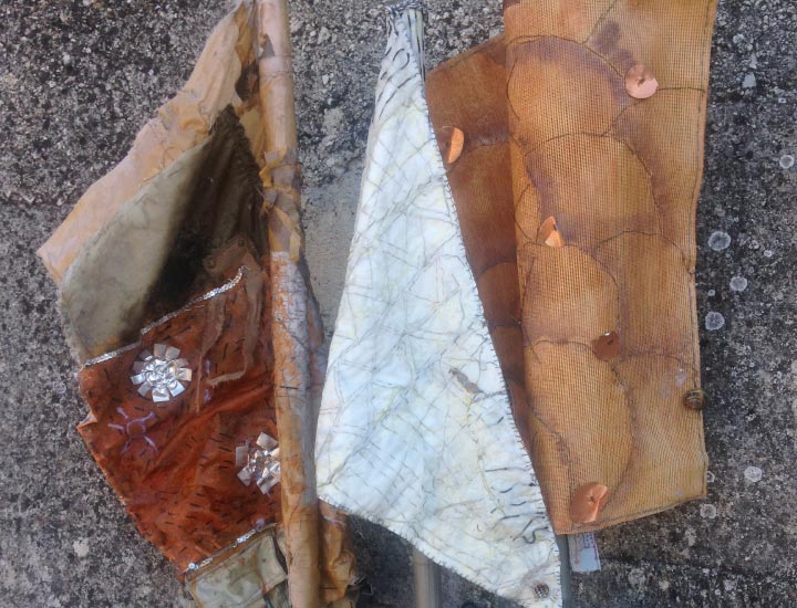 Le lance o bandiere sono realizzate con la tecnica boro, termine giapponese per indicare un insieme di tessuti riciclati e rammendati utilizzati dalle popolazioni rurali come un racconto.